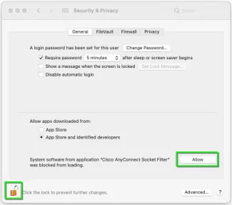 - در تنظیمات سیستم > امنیت و حریم خصوصی، روی اجازه دهید کلیک کنید تا افزونه تأیید شود. ممکن است لازم باشد روی قفل در گوشه پایین سمت چپ کلیک کرده و اطلاعات ورود به سیستم مدیر را وارد کنید تا این تنظیم تغییر کند.