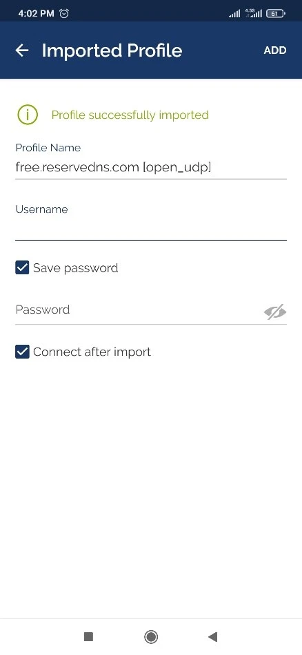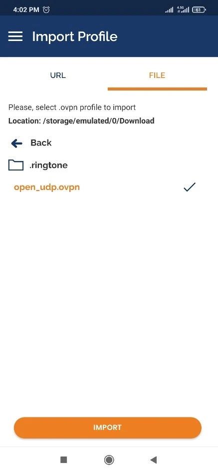 در OpenVPN Connect، به تب File رفته، روی BROWSE کلیک کنید، فایل .ovpn دریافتی را پیدا کرده و آن را وارد کنید. سپس در صفحه بعد، نام کاربری و رمز عبور پروفایل را وارد کرده و دکمه CONNECT را فشار دهید.