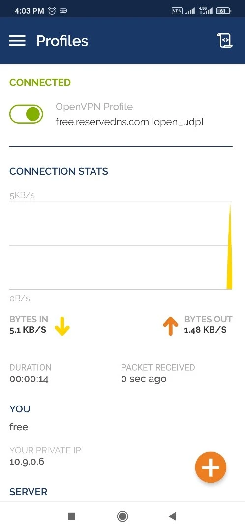 - برای اتصال به VPN، OpenVPN Connect را شروع کنید، یک فایل .ovpn وارد شده را انتخاب کنید و دکمه رادیویی را فشار دهید.